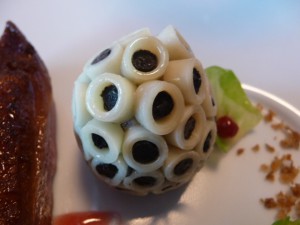 Les deux chefs font part aux gourmets présents que de nouvelles techniques sont développé dans ce concours qui sont ensuite adaptées aux contraintes de la restauration de tous les jours. A l’époque de Michel Roth les poissons n’étaient pas encore cuits à la sonde ; la pâte brique qu’il utilisa pour ses bonbons de pruneaux en était à ses balbutiements ; c’était une gageure de tenir un plat chaud avant d’être consommé par le jury avec les moyens de ce temps. Franck Giovannini tout comme Michel Roth avec l’oeuf, se creusa longuement les méninges comment faire tenir une pomme de terre debout (celles que l’on aperçoit au bord du plat ci-dessous en forme de voilier). Dès lors, que le cuisinier soit premier ou dernier, c’est un apprentissage qui servira dans la future carrière.